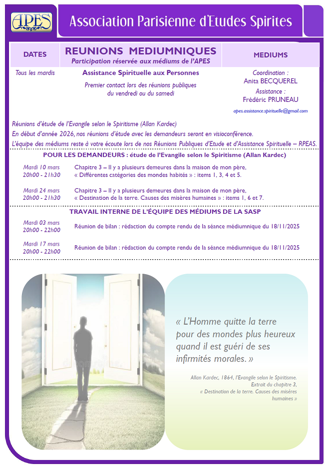 Le Centre Spirite APES, est une partie intégrante et statutaire de l'Association Parisienne d'Etudes Spirites - APES, se situant dans les orientations d'Allan Kardec inscrites dans ses oeuvres, et que forment le "corpus" de la Doctrine Spirite, a pour mission, d'une part étudier et diffuser ces orientations, et d'autre part, mettre en pratique cette étude pour apporter de l'Assistance Spirituelle à tous ceux qui la demandent par : l'accueil fraternelle, la prière, la passe spirite, la fluidification d'eau, réunions d'études spirites, les séances médiumniques, etc ... Ces pratiques spirites sont réalisées sous l'orientation de l'Esprit guide du Centre Spirite APES et selon l'éthique spirite : de l'écoute, de la bonne volonté, de la gratuité, sans aucun jugement, avec amour et respect de l'autre. Fidèles à notre engagement d’approfondir ensemble de ces enseignements du Spiritisme dans un esprit sérieux, de réflexion et de fraternité, nous avons le plaisir de vous inviter aux Réunions Publiques d'Etude et d'Assistance Spirituelle (RPEAS). Ces réunions se réalisent en distanciel, via plateforme ZOOM WORKPLACE, une fois par semaine en alternance : une semaine le samedi après-midi de 15h à 17h, et la semaine suivante le vendredi soir de 20h à 22h, ainsi de suite. Veuillez trouver en pièce jointe le programme d'activités spirites de MARS 2026 Pour assister les Réunions Publiques d'Etudes et d'Assistance Spirituelle (RPEAS) veuillez accéder les modalités de participation sur la page WEB de notre centre spirite APES : http://www.apes-asso.fr Nous espérons que cette organisation expérimentale permettra à chacun de continuer à s’instruire, à échanger et à progresser dans la compréhension les principes, les concepts et l'éthique spirite, dans un climat de respect et d’élévation morale. Pour plus d'information, contactez nous par téléphone 07 8209 7158 ou par mail : [email protected] Nous vous remercions pour votre fidélité et votre soutien, et nous nous réjouissons de vous retrouver prochainement lors de ces prochaines réunions hebdomadaires d’étude spirite. Fraternellement, Anita Becquerel Présidente de l'APES A.P.E.S. - Association