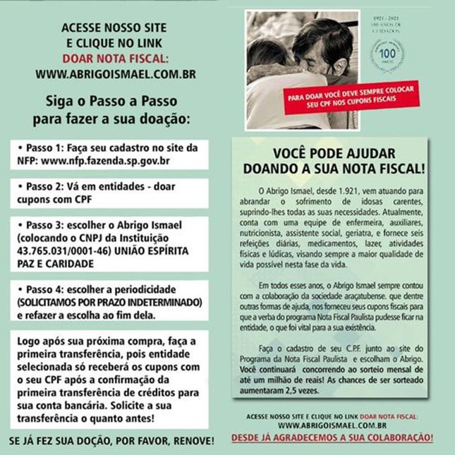Quer ajudar o Abrigo e não sabe como? Doando sua nota fiscal paulista, você estará ajudando nossas vovós. Faça a doação on line de seu cupom fiscal para o Abrigo Ismael! É fácil, rápido, você ajuda a entidade e ainda tem 2,5 vezes mais chances de ser sorteado!
