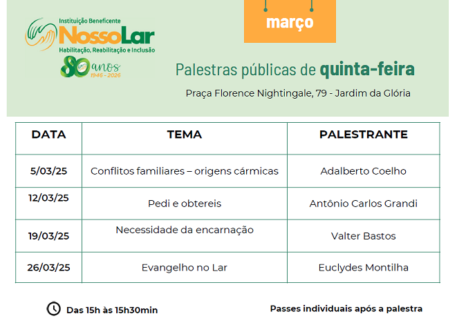 Palestras Instituição Beneficente Nosso Lar- IBNL março 2026 |